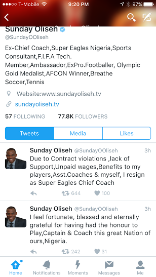 REAL REASONS SUPER EAGLES MANAGER, SUNDAY OLISEH RESIGNED